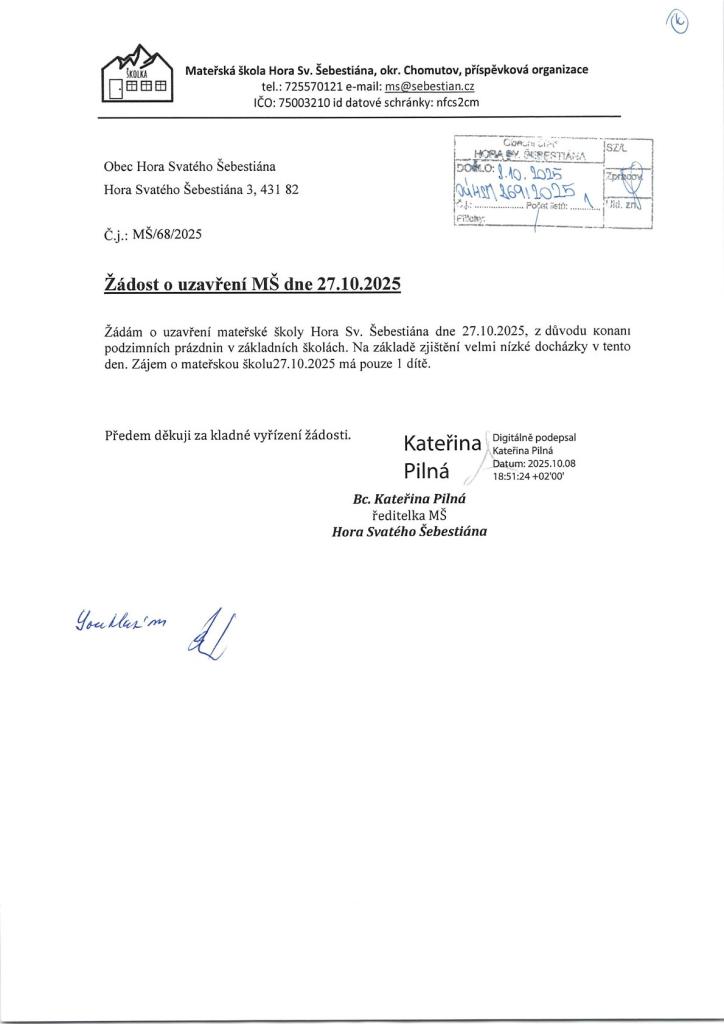 Dne 27. 10. 2025 je MŠ uzavřena. Důvodem je nízky zájem o otevření a to především z toho důvodu, že na ZŠ jsou naplánované podzimní prázdniny.